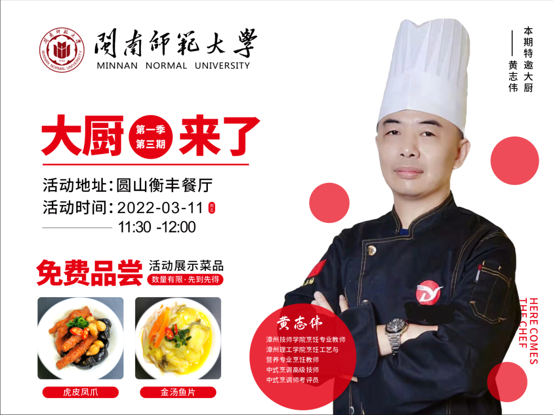 新学期新气象新开始,自然也要有新的美食相伴啦,第三期“大厨来了”伴随着春天的脚步一起到来了~这次,我们特邀大厨走进圆山校区,让圆山师生们也能现场目睹大厨风采,一饱口福!
