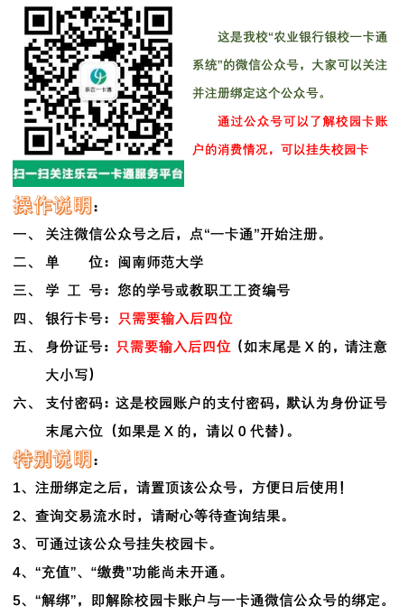 近期,我处与农业银行商定,对校园一卡通系统进行升级改造。首先推出线上服务平台,通过微信绑定“乐云一卡通”微信公众号,扫码即可完成校内电瓶车交通服务支付功能。今后还将把此功能推广到食堂、餐饮、店面、超市等校园日常生活中,为全校师生提供更加高效、便捷的线上支付体验。