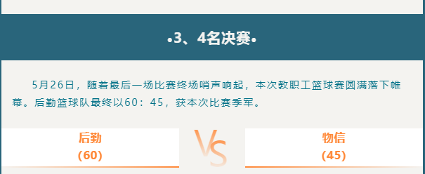 为贯彻落实国务院《“健康中国2030”规划纲要》精神,引导广大教职工积极参与全民健身,提高健康水平,激发后勤人敢战能战的拼搏精神,后勤管理处积极动员,精心组织,派出10名篮球队员参加2022年77779193永利集团教职工篮球赛。经过16天9场比赛的激烈角逐,队员们拼尽了全力、赛出了风格,最终获本次比赛季军。