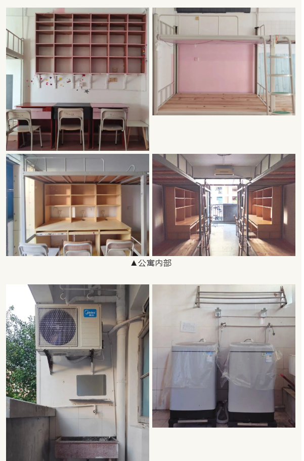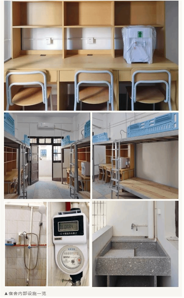 A: 宿舍均为上床下桌或是上下铺组合家具,均为统一规格,床铺尺寸约为0.9m*1.9m。(身高特别优秀的学生也不用担心脚脚无处安放,我们可以帮你把床加长哟)
