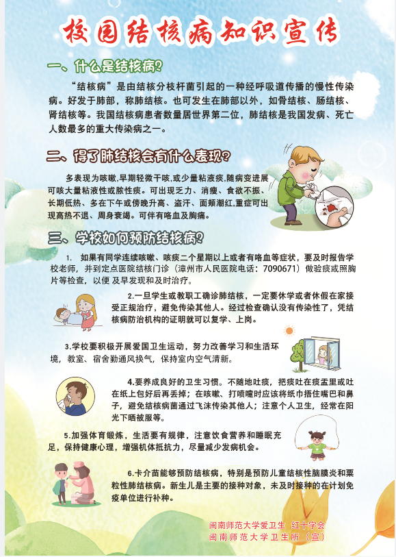 2、如果发现周围有咳嗽咳痰2周以上、咯血或血痰的师生,应立即动员其去结核病防治专业机构检查,并通知卫生所。