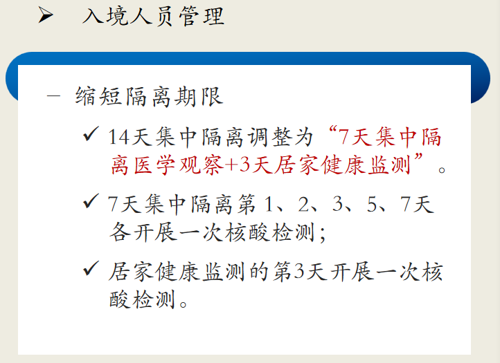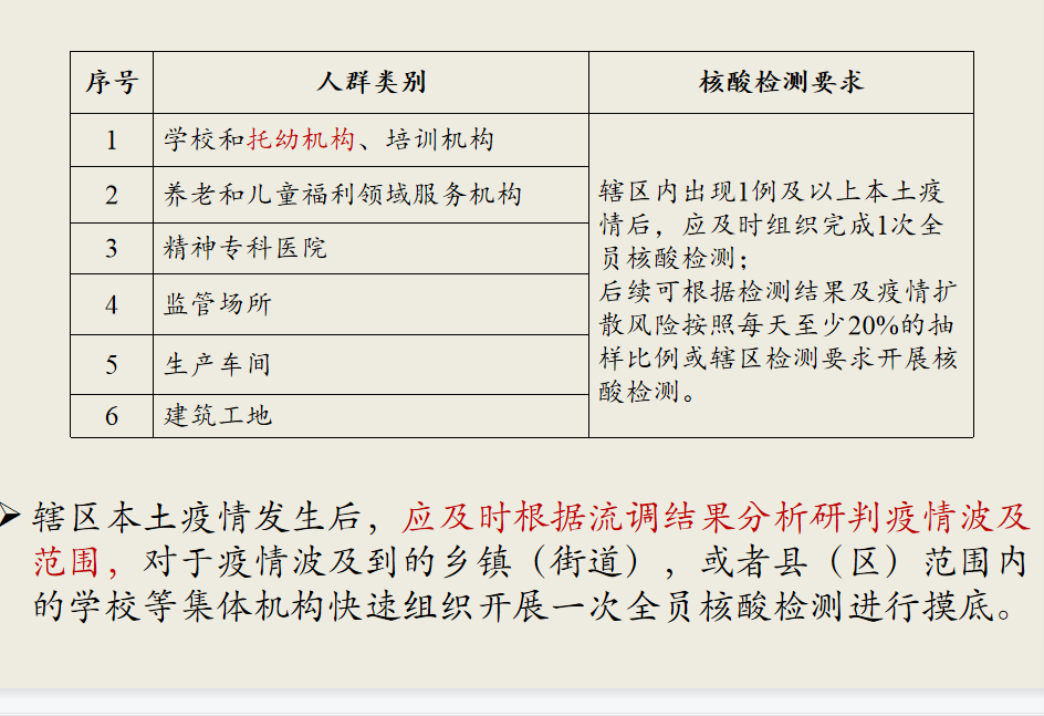 加密风险职业人群核酸检测频次,将与入境人员、物品、环境直接接触的人员核酸检测调整为每天1次,对人员密集、接触人员频繁、流动性强的从业人员核酸检测调整为每周2次。