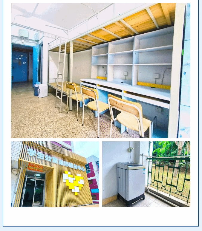 宿舍楼内的公共设施包括:共享洗衣机、热水饮水机、应急医药箱